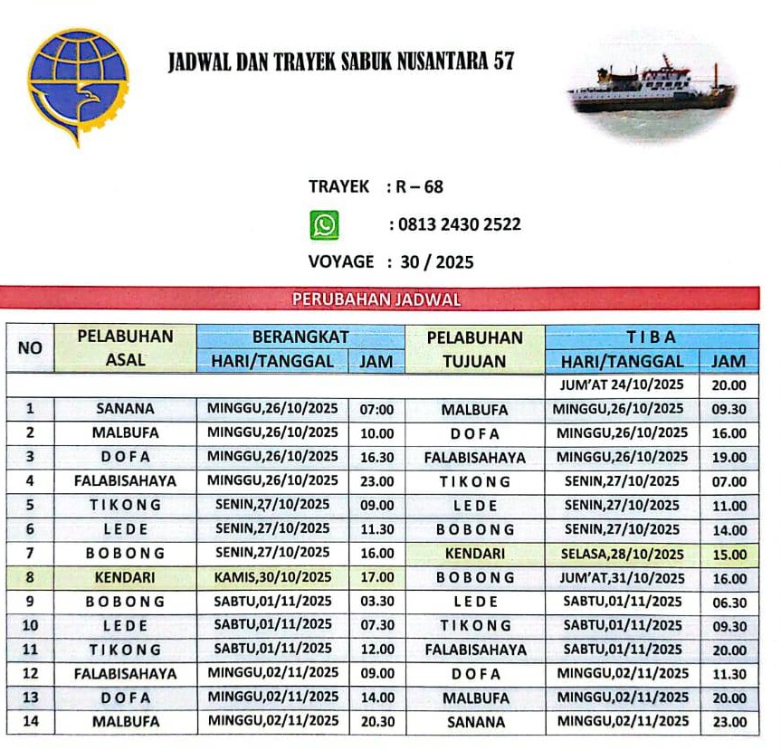 | Kendari – Bobong | Kamis, 30 Oktober 2025 Pk 17:00 | Jumat, 31 Oktober 2025 Pk 16:00 |