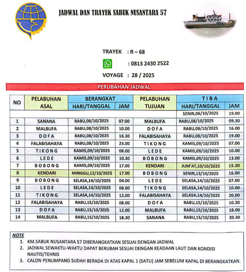 Waktu Tiba KM Sabuk Nusantara 57 : Rabu, 08 Oktober 2025 Pk 16 : 00 - Jadwal Kapal Sabuk Nusantara 57 Dofa Falabisahaya